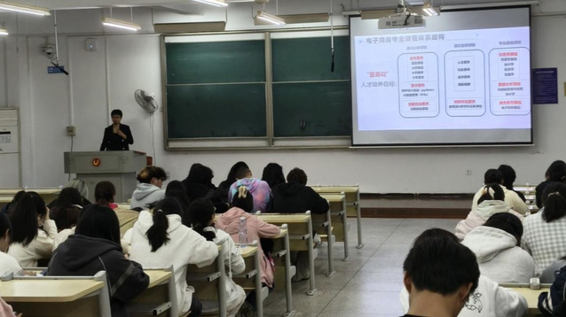 本网讯(通讯员:段童馨 审核:陶鹏) 11月2日晚,我院在二号教学楼301教室举办电子商务专业培养方案解读讲座,由电商系系主任刘芬老师主讲,电商2541、电商2542全体学生参会。
